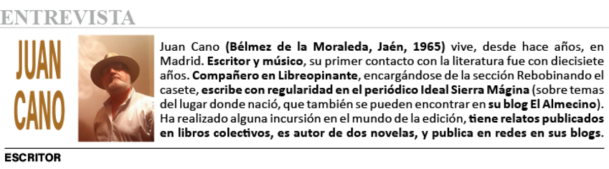 Juan Cano (Bélmez de la Moraleda, Jaén, 1965) vive, desde hace años, en Madrid. Escritor y músico, su primer contacto con la literatura fue con diecisiete años. Compañero en Libreopinante, encargándose de la sección Rebobinando el casete, escribe con regularidad en el periódico Ideal Sierra Mágina (sobre temas del lugar donde nació, que también se pueden encontrar en su blog El Almecino). Ha realizado alguna incursión en el mundo de la edición, tiene relatos publicados en libros colectivos, es autor de dos novelas, y publica en redes en sus blogs.
