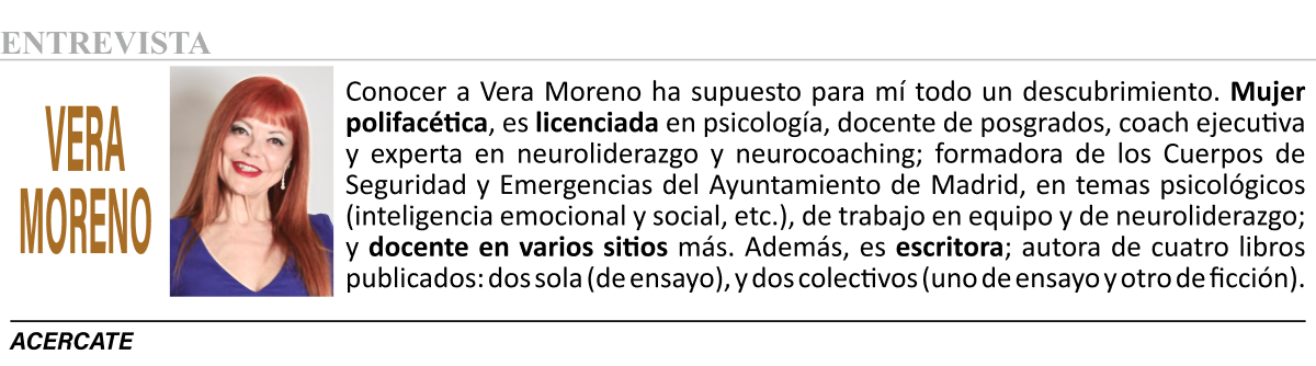 A mi pregunta de si se ha quedado con ganas de hablar de algo más, Vera me responde que si me parece poco lo que ha contado; no lo es, es cierto que ha sido generosa en su relato, pero tengo que reconocer que a mí me ha dejado con ganas de más. Especializada en Psicología Clínica y de la salud, Vera forma, principalmente, a psicólogos y a directivos. Es autora de Liderazgo Constructivo y Método ACERCATE. Mejora tus relaciones interpersonales desarrollando tu Inteligencia Social; también de Historias de Vida que dan Vida. Resiliencia en estado puro (escrito con once personas, a partir de una idea suya y coordinado por ella) y De tentaciones y culpas. 15 Relatos de pecados (escrito con otras catorce personas y su primera incursión en el género de ficción). Alumna de Método Mapea, método desarrollado por Roger Domingo, mediante el cual ayuda a personas que quieren ser capaces de escribir un buen libro y publicarlo con una buena editorial. Vera Moreno (aconsejo a nuestros lectores quedarse con este nombre) es una persona que intuyo que tiene todavía mucho que hacer, decir y, por supuesto, escribir.