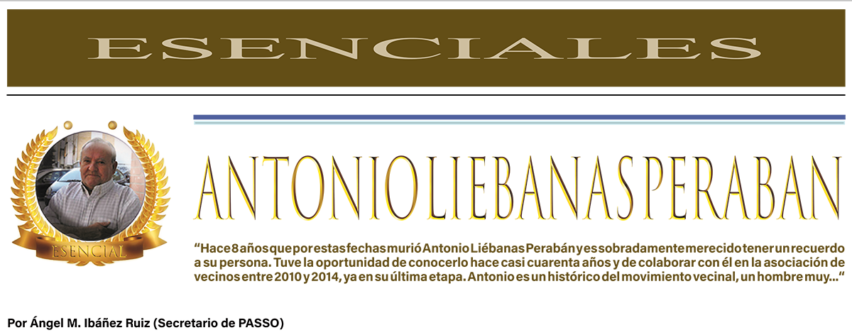 Para mí Antonio Liébanas Perabán representa el liderazgo que necesitaba la Asociación en una época en que había que luchar y aglutinar a los vecinos en torno a los problemas y necesidades que había. Ese fue su papel inicial e indispensable. Hablar de Antonio es hablar de la Asociación de Vecinos PASSO de la que tantas veces nos hemos referido siempre a la cabeza de las justas demandas del barrio. Tenía la capacidad natural de dirigir, que no es la de mandar, dando seguridad y confianza a los que le acompañábamos cuando había que subir al ayuntamiento, coger unos bafles para anunciar un acto u organizar una protesta. Antonio era alguien que tenía fe en la necesidad de un movimiento vecinal, genuino, fuerte, serio y reivindicativo y, por tanto, en la capacidad y la fuerza de los vecinos. Por eso no cabía en preguntarse si merecía la pena tantos sinsabores, aguantar la crítica injusta o la falta de respuesta. Tenía ese don porque era auténtico, se lo creía, no había apariencia ni falsedad en ese aspecto, como por desgracia tanto de esto nos sobra hoy en día.