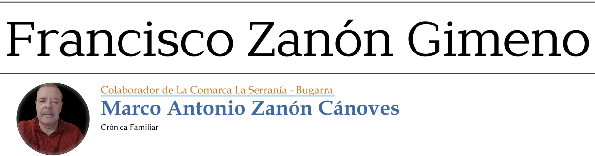 Mi abuelo paterno se llamaba Francisco Zanón Gimeno y nació en Bugarra en el año 1897. Tuvo dos hermanos más, Santiago, el mayor de los tres, y Gabriela. Durante su infancia asistió a la escuela, donde recibió una educación elemental muy básica, al mismo tiempo que, como el resto de chicos del pueblo, ayudaba a su padre en las labores del campo.