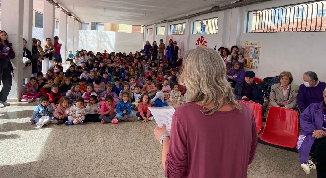 Jaén, 8 de marzo de 2023.- La comunidad educativa del CEIP Alcalá Venceslada ha culminado la celebración del Día Internacional de las Mujeres en un acto central en el patio del colegio en el que ha participado todo el alumnado de infantil y primaria, el profesorado del centro, el AMPA del centro “Las Eras”, profesorado jubilado, así como dos “Mujeres Jaeneras”, Ana María Martos López y Carmen Molina.