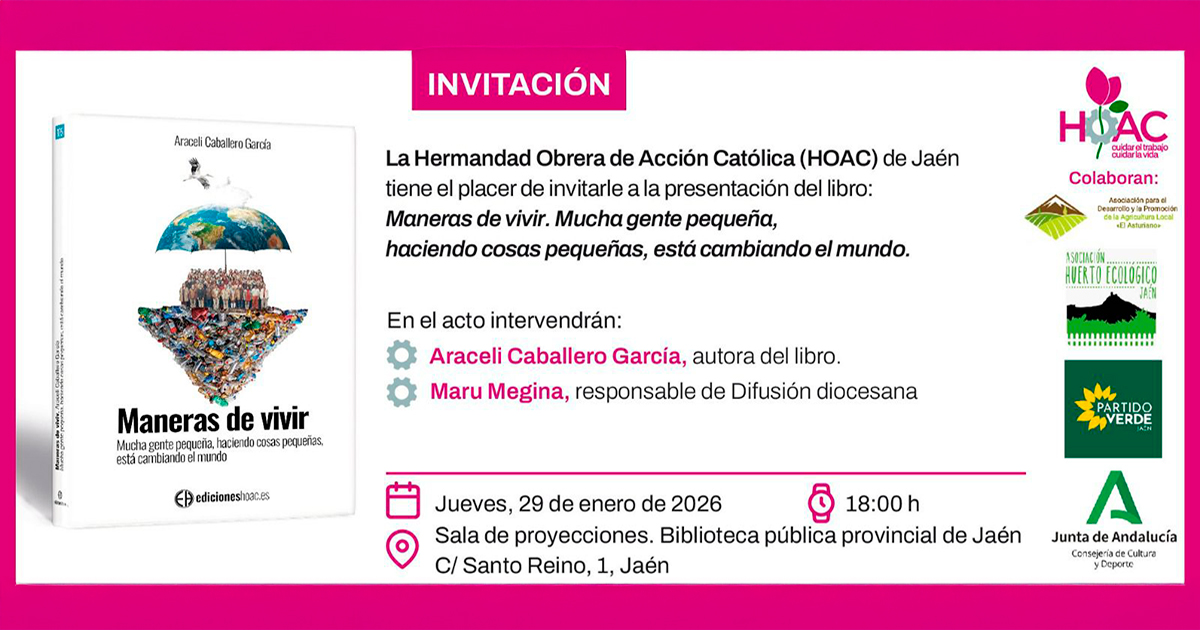 El próximo jueves 29 de enero, a las 18:00 horas, la Biblioteca Provincial de Jaén acogerá la presentación del libro Maneras de vivir, de la escritora Araceli Caballero, en un acto abierto a la ciudadanía y especialmente dirigido a colectivos y personas comprometidas con el mundo obrero, el trabajo, la justicia social y el cuidado de la Casa Común.