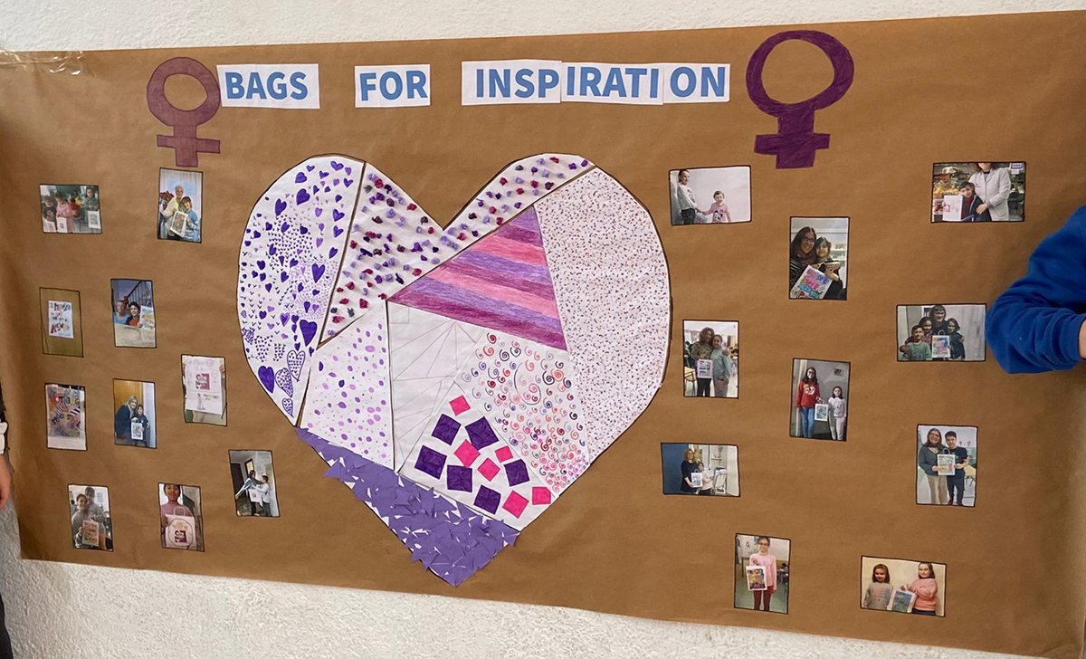 A continuación, el alumnado como protagonista ha entonado en un inmejorable francés la canción “Je Veux” de la cantante ZAZ y ha realizado coreografías sobre canciones referidas a la lucha de las mujeres como “Ain´t your mamma” de Jennifer López, “Mujer de mil batallas” de Manuel Carrasco y las chicas son guerreras del grupo Coz. Por otro lado, el alumnado ha dado lectura a “La mujer que mueve el mundo”, se ha declamado un decálogo por la igualdad y durante toda la semana se han decorado bolsas de papel con frases en inglés de mujeres famosas a lo largo de la historia, bolsas para la inspiración, ”Bags for inspiration”, ya que el alumnado se las ha regalado a mujeres de su entorno, de su comunidad, familia, amigas, tenderas, peluqueras… para así divulgar el pensamiento de estas mujeres. Con las fotos en las que se mostraba el regalo de la bolsa, se ha realizado un mural que ha presidido el porche del centro, donde se ha conmemorado el acto central del 8M.