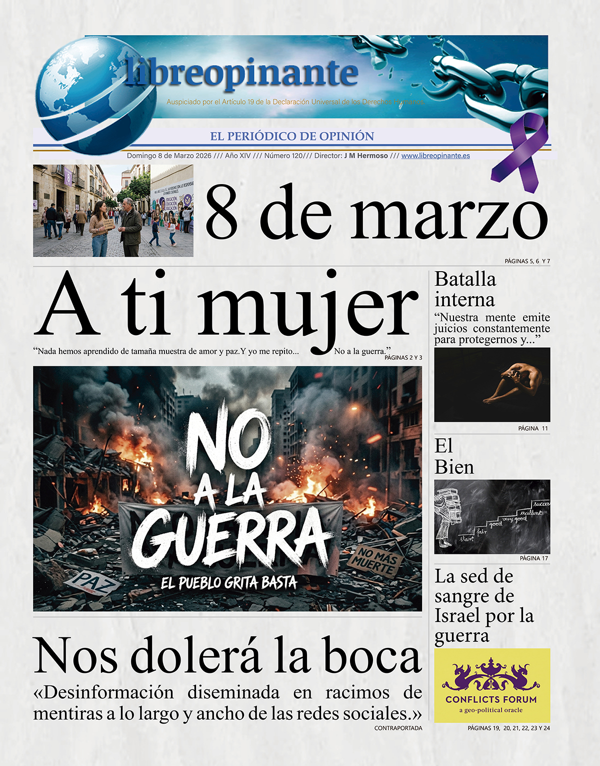 "Cuando se publique esta crónica será el 8 de marzo. La amenaza de nuevas guerras traza cambios letales en el mapa de las ciudades y el campo, donde brota la vida. |