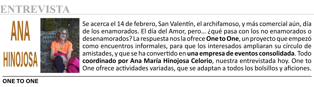 De esta entrevista y de su cuestionario final se deduce, o así lo hago yo, que One to One es un gran grupo de AMISTAD. ¿Se puede encontrar el amor? Entiendo que SÍ. ¿Es ese el objetivo que persigue? En mi opinión, la respuesta es un rotundo NO. De acuerdo con estas premisas, y para quienes todavía no tengan plan para el fin de semana del 14 de febrero, One to One sería la opción perfecta para que los desenamorados disfruten de El Día de los Enamorados, sin expectativas de nada, pero abiertos a todo, en un ambiente de amistad sana y camaradería, realizando variadas actividades (siempre entre personas sin pareja) de forma divertida y amena, natural y, sobre todo, PRESENCIAL. Ver, oír, tocar, oler, incluso saborear en compañía (disfrutar de los cinco sentidos, en definitiva): lo que las nuevas tecnologías no ofrecen en su totalidad y One to One lo sirve en bandeja. Presentes en España, en las provincias de Córdoba, Sevilla y Jaén, aunque en ocasiones también se desplazan por toda la geografía, cualquier información se encuentra en su página web: https://onetooneandalucia.com Detrás de todo esto, podríamos decir que capitaneando el barco, Ana María Hinojosa Celorio, auxiliar administrativa y guía de senderismo, una mujer que ha investigado y se ha documentado sobre los procesos de recuperación después de las pérdidas amorosas; con casi una década dedicada a crear conexiones entre personas, confiesa su pasión por ayudar a otros a encontrar un espacio donde se sientan comprendidos, acompañados y apoyados en su recuperación. One to One no es solo una empresa de eventos, sino un lugar donde las personas sin pareja pueden crear amistades duraderas y sentirse acompañadas en cualquier etapa de su vida; Ana, un pilar fundamental para conseguirlo.