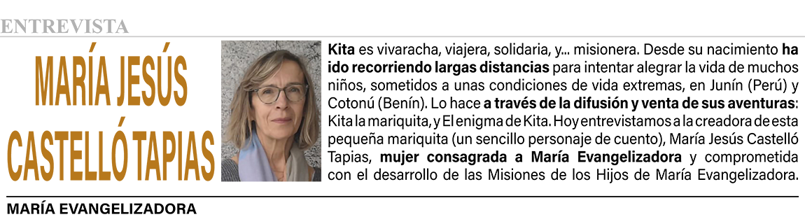 Conocí a María Jesús en un taller de escritura (impartido por Isabel Cañelles). Ya, desde un primer momento, me llamaron la atención la sensibilidad que desprendía en sus textos y su personalidad, muy cercana. Luego la seguí conociendo y descubrí también su carácter solidario, entre otras virtudes, que hacen que me sienta feliz de tenerla como amiga. Gracias, María Jesús, por concedernos esta entrevista. Espero que Kita siga viajando y llevando alegría y ayuda a esos niños que tanto la necesitan.