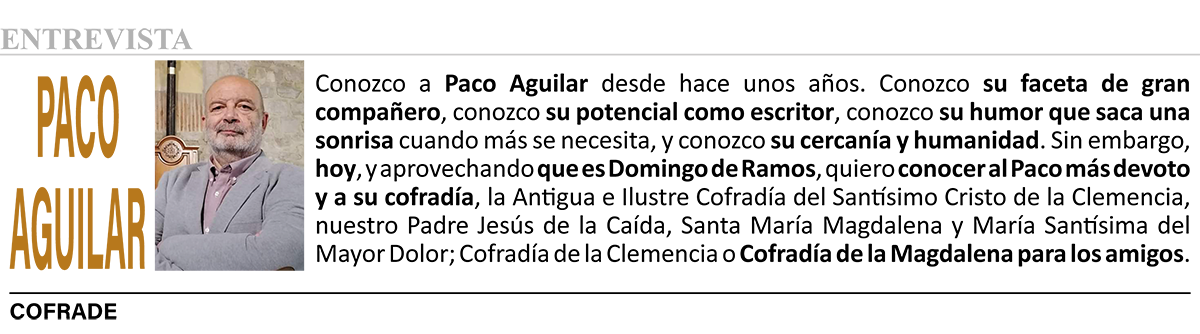 Conozco a Paco Aguilar desde hace unos años. Conozco su faceta de gran compañero, conozco su potencial como escritor, conozco su humor que saca una sonrisa cuando más se necesita, y conozco su cercanía y humanidad. Sin embargo, hoy, y aprovechando que es Domingo de Ramos, quiero conocer al Paco más devoto y a su cofradía, la Antigua e Ilustre Cofradía del Santísimo Cristo de la Clemencia, nuestro Padre Jesús de la Caída, Santa María Magdalena y María Santísima del Mayor Dolor; Cofradía de la Clemencia o Cofradía de la Magdalena para los amigos.