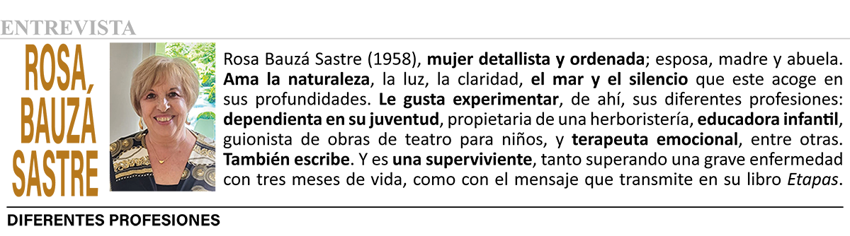 Agradezco a Rosa estas palabras repletas de sabiduría, pues, sin ocultar la crudeza de la vida, intenta sacar en cada una de sus etapas el lado positivo y amable de la misma, que nos permita conducirnos por ella de la mejor manera para no naufragar en un mar embravecido, pero tremendamente bello cuando está en calma. Me voy a permitir extraer unas palabras del Prólogo de su libro Etapas, de uno de los testimonios en él recogidos donde, a mi parecer, se muestra la esencia de esta obra: ella quería aportar luz sobre las etapas de la vida, pero, además, quizás sin pretenderlo, también desnudar su alma, ayudando a sus lectores a entender mejor lo que viven o vivirán. Rosa escribe desde el corazón, reconoce en cada día un presente y, para ella, vivir es una gran aventura. Con su libro Etapas nos invita a brindar, juntos, por la vida.