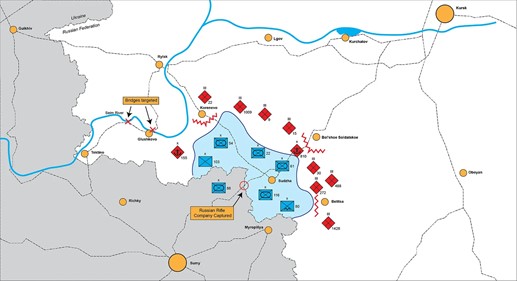 En cualquier caso, con la sorpresa estratégica lograda, las fuerzas ucranianas consiguieron adelantarse a la delgada defensa rusa y penetrar en la frontera en las primeras horas. Las defensas rusas en estas regiones consisten principalmente en obstáculos como zanjas y campos de minas, y no cuentan con posiciones de combate bien preparadas. La naturaleza de estas barreras sugiere que los rusos se centraban principalmente en impedir e interceptar las incursiones, más que en defenderse contra un asalto serio. Al principio, elementos del 88º Ejército lograron inmovilizar a la compañía de fusileros rusos estacionada en el paso fronterizo y tomar un número considerable de prisioneros. Las ahora famosas fotos que circulan en las que aparecen muchas docenas de rusos rendidos proceden de este puesto de control fronterizo, situado literalmente en la frontera estatal.